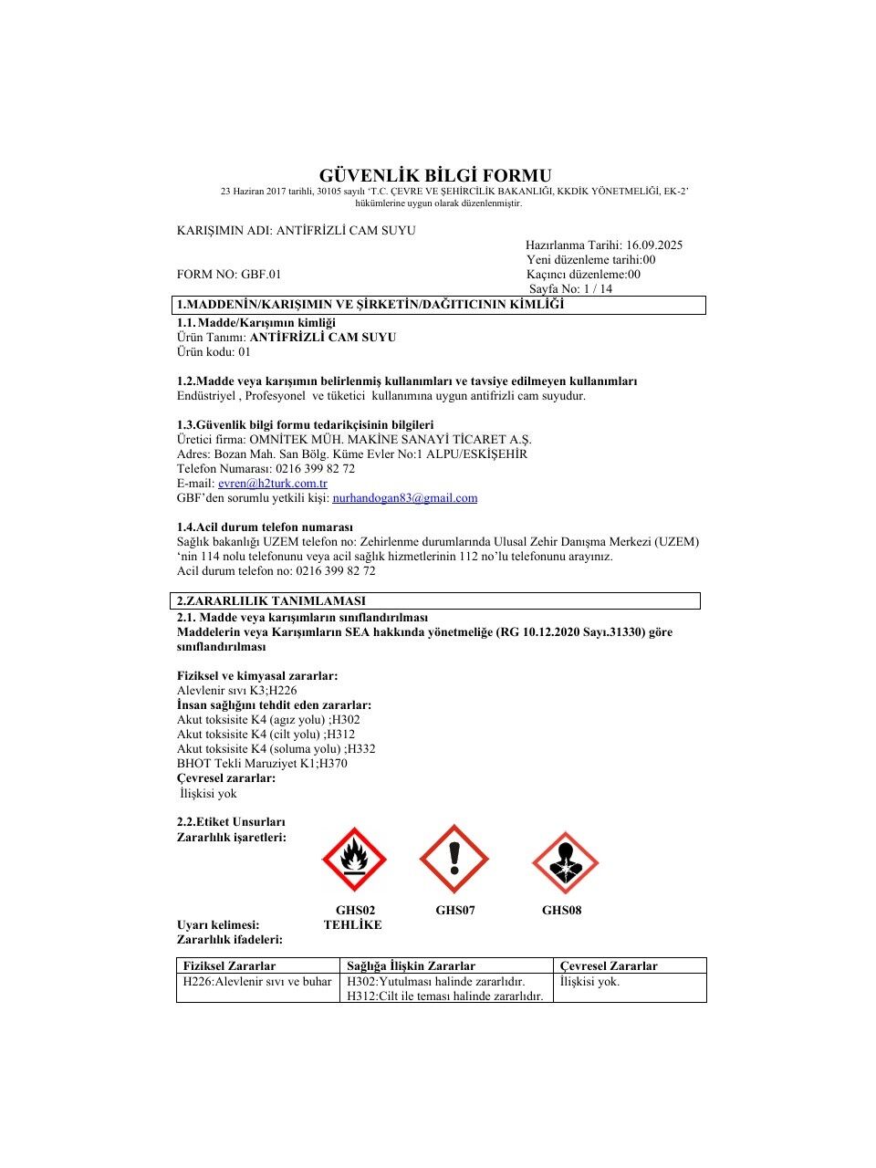 | Renk / Koku | Renksiz / Parfümsüz |